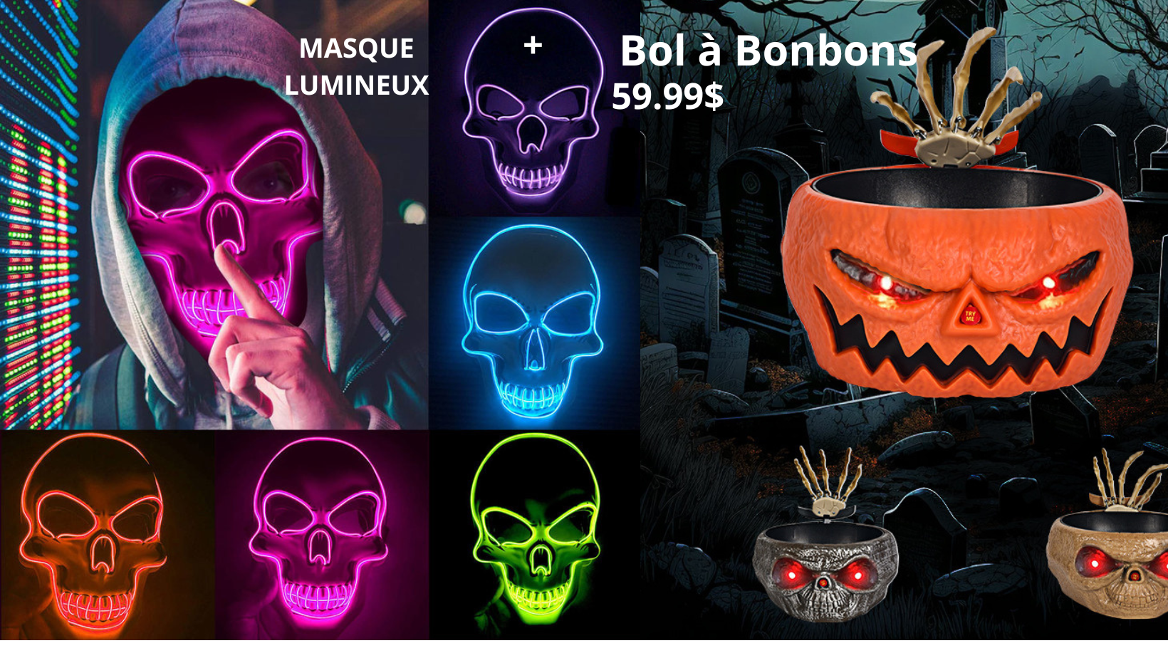 Combo Halloween Édition Limitée – Bol à bonbons + Masque LED Halloween Effrayant!